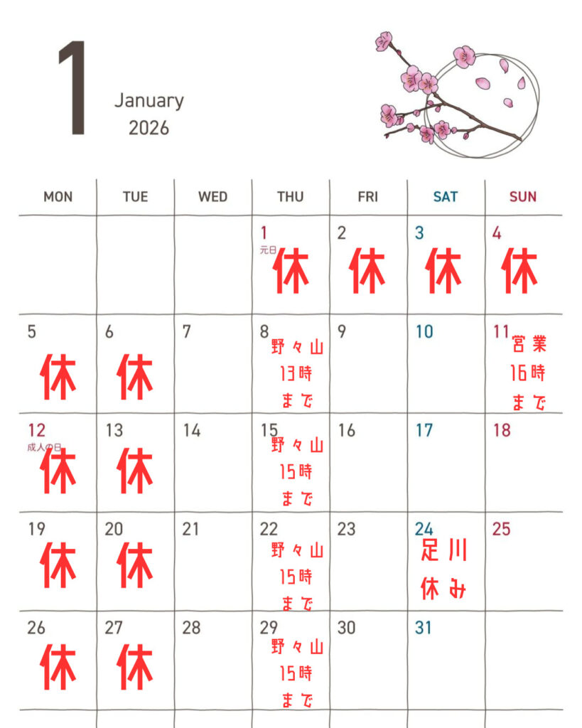 1月の定休日は5日、6日、12日、13日、19日、20日、26日、27日です。
